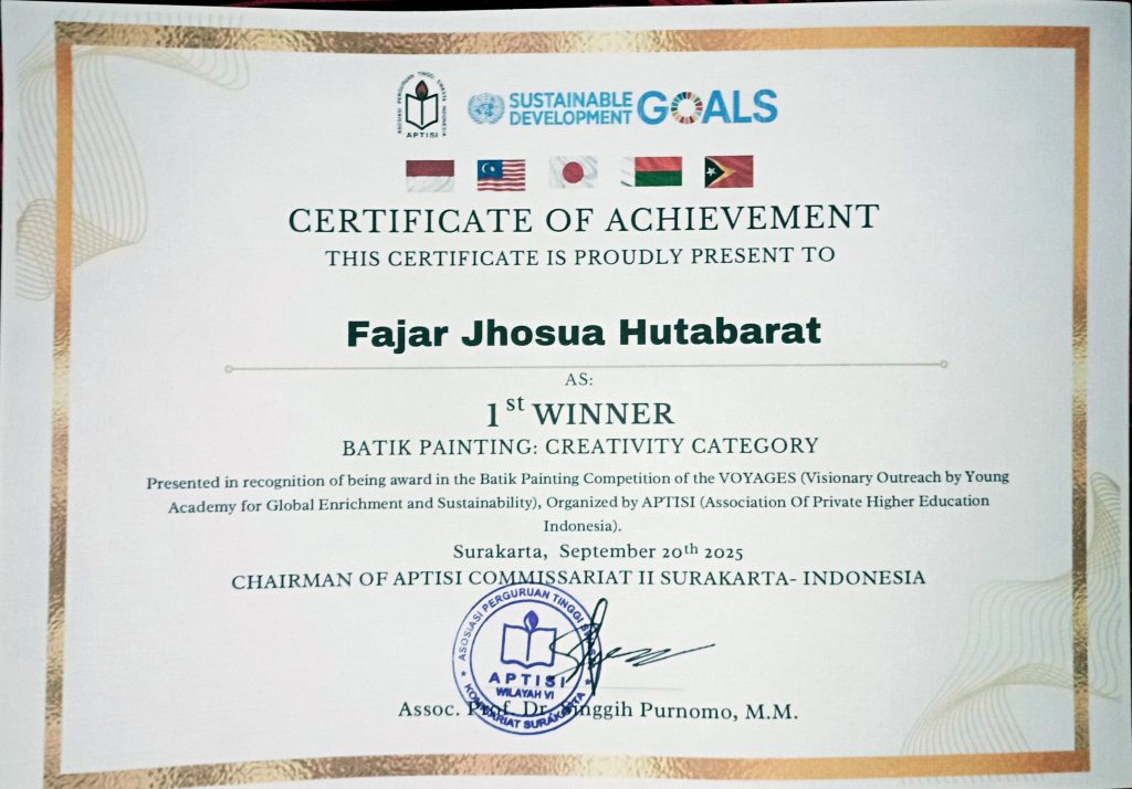 Sukoharjo, 19 September 2025 – Fajar Jhosua Hutabarat mahasiswa Program Studi Teknik Industri angkatan 2023, berhasil meraih Juara 2 dalam lomba kreativitas Batik Painting Competition (Onsite) pada ajang Visionary Outreach by Young Academics for Global Enrichment and Sustainability (VOYAGES 2025). Kompetisi ini diselenggarakan oleh APTISI (Asosiasi Perguruan Tinggi Swasta Indonesia) Komisariat II Surakarta dan diikuti oleh mahasiswa dari berbagai perguruan tinggi swasta di wilayah Surakarta.